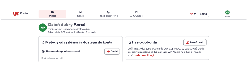 Od teraz to w WP Koncie szybko zmienisz hasło do poczty, ustawisz metody odzyskiwania dostępu do konta lub włączysz logowanie dwustopniowe. Zalogujesz się do niego tutaj.