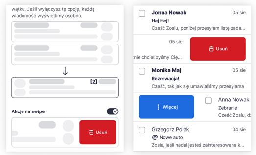 Przesuń wiadomość: w lewo, by ją usunąć lub w prawo, by zobaczyć więcej akcji.